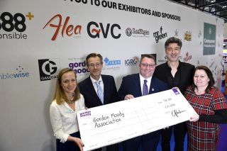 Ewa Bakun (far left), presenting £35,000 cheque from Consumer Protection Zone sponsors to Gordon Moody Association at ICE London 2019.