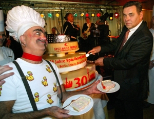 Um Mitternacht wurde eine Mega-Geburtstagstorte in den Saal gerollt, die unter großem Beifall der Gäste von Günter Münstermann und der Staatsekretärin vom Senat für Finanzen Frau Thöne angeschnitten wurde. Auch da war der Abend noch nicht beendet, denn die Artisten von Pomp Duck and Circumstance servierten als Degestif noch einen Auszug aus ihrem spritzigen Showprogramm.