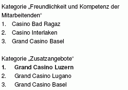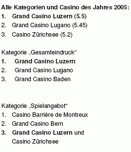 Luzern, 30. Januar 2006 – Die Benutzerinnen und Benutzer der unabhängigen Internetplattform www.casinos.ch haben das Grand Casino Luzern zum besten Casino der Schweiz gewählt. Auf den Plätzen zwei und drei folgen das Grand Casino Lugano und das Casino Zürichsee. Nominiert waren alle sieben A-Casinos und zwölf B-Casinos der Schweiz. Bewertet wurden die Kategorien Gesamteindruck, Freundlichkeit und Kompetenz der Mitarbeitenden, Spielangebot sowie Zusatzangebote. Das Grand Casino Luzern ging als Gesamtsieger aus allen vier Kategorien hervor.