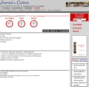 Webseite des Journal de Casinos „Für mich war der wichtigste Punkt, eine solche Partnerschaft einzugehen, die Seriosität und die Zielrichtung der Informationspolitik, die wie in unserem Internet Portal „Journal de Casinos“, immer neutral sein muss. Die ISA-CASINOS erfüllt genau diese Anforderungen.“ Der französische Markt, mit seinen vielen unterschiedlichen Casinos, ist sehr weit gefächert und die Nachfrage nach Nachrichten aus Europa ist enorm. Mit dem Zusammenschluss beider Unternehmen und im Austausch von Nachrichten kommen wir unseren Lesern aus Frankreich entgegen. Ich glaube, dass wir mit der ISA-CASINOS den besten Partner aus dem Internet-, Casino- und Spielbanken-Bereich für diese Kooperation gewinnen konnten. Selbstverständlich werden wir auch auf der Messe in London 2007 intensiver zusammen arbeiten, um neue Märkte und Kunden zu erschließen.“