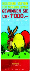 Was für eine Osterüberraschung: Packen Sie Ihre Chance und gewinnen Sie CHF 1’000.–! Füllen Sie einfach einen Talon aus und gehen Sie im Spielbereich auf Eiersuche – drei übergrosse Exemplare haben wir versteckt. Werfen Sie den Talon bis am 17. April in dasjenige Ei, in dem Sie das goldene mit dem Bargewinn vermuten. Aus den Teilnehmern, die das richtige Ei gewählt haben, wird per Los der Gewinner ermittelt.