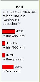 Ein entsprechender Poll mit den Antwortmöglichkeiten: „Ich habe bereits mein Lieblingscasino in der Nähe gefunden“ oder aber „Ich habe keine Lust, keine Zeit oder kein Geld für weite Wege“ bis hin zu „Ich schaue mich gern um, um zu sehen, was andere Casinos bieten“ oder „Ich verdiene damit mein Geld und Reisen gehört dazu“, etc., würde dem jetzigen Poll eine weit genauere Bewertungsmöglichkeit zur Verfügung stellen.