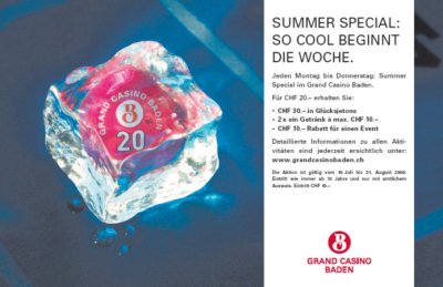 Ab dem 10. Juli 2006 gibt es wieder das beliebte „Summer Special“ Package. Für CHF 20.- kann jeder Gast ein Gutscheinbooklet erwerben, welches ihm CHF 30.- Startguthaben, zweimal ein Getränk an einer der Casino-Bars à max. CHF 10.- sowie CHF 10.- Rabatt für die Teilnahme an einem der Events am Mittwoch- oder Donnerstagabend. Weitere Informationen zum Package sowie zu allen Aktivitäten in unserem Hause sind jederzeit ersichtlich unter www.grandcasinobaden.ch.
