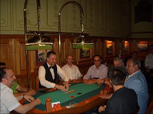 Die Herren der Schöpfung waren also unter sich. Nach der Rebuy-Phase, die an einem Tisch sehr viel turbulenter war als an den anderen, begann die etwas ruhigere zweite Hälfte des Turniers. Ein Beispiel: 3 Top Paare (Bube, Dame, 10) treten gegeneinander an. Nach dem Show-Down teilen sich alle die kleine Straße auf dem Board. Spannender wurde es wieder bei den letzten beiden Tischen, die synchron gedealt wurden. Dies allerdings sorgte für eine Art Völkerwanderung: Die Gäste des wartenden Tisches liefen zum jeweils anderen Tisch um den Spielverlauf zu beobachten. Die Spannung hielt fast eine Stunde, bis auch der 32. Spieler „eliminiert“ war und die verbleibenden 10 sich zum Finale-Table begaben. Dann ging es Schlag auf Schlag: Bereits im ersten Spiel schied der erste Finalist aus und erhielt wie üblich von jedem seiner Konkurrenten einen „Lui“ als Preisgeld. Nach einer Stunde Spielzeit einigten sich dann die restlichen 4 Mitspieler bei annähernd gleichen Table-Stakes auf einen Deal und so standen bereits um 1:40 Uhr die Gewinner fest. Der Drittplatzierte gewann 1.960 Euro, der Zweitplatzierte „Dr. Mabuse“ 3.020 Euro und der strahlende Sieger Jürgen Paoletti freute sich über 4.980 Euro Preisgeld.