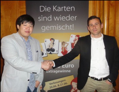 Nachdem das gestrige 200er Montagsturnier wiederum ausverkauft bzw. mit einer Person überbucht war, konnte sich nach hartem, aber fairen Kampf Herr Jia Tse (im Bild li.) vor Herrn Konstantin Tselios (re. im Bild) behaupten.