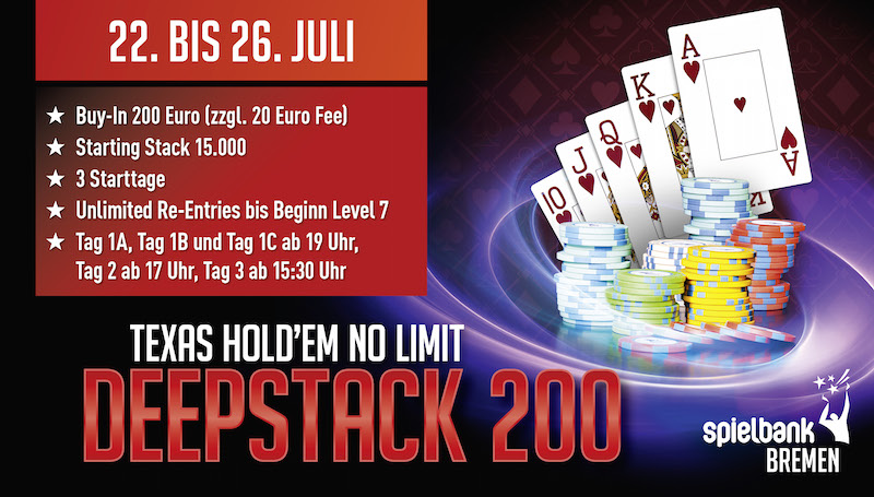 Bremen, 16. Juli 2015. Das Bremer „Deepstack 200“ ist seit langem ein beliebtes Format bei Pokerfans. Vom 22. bis 26. Juli lädt die Spielbank der Hansestadt zur nächsten Auflage. Für ein Buy-In von 200 Euro (zzgl. 20 Euro Fee) gibt es 15.000 Chips, die Levels werden alle 45 Minuten erhöht. Bis zum Beginn von Level 7 sind unbegrenzt Re-Entries möglich.