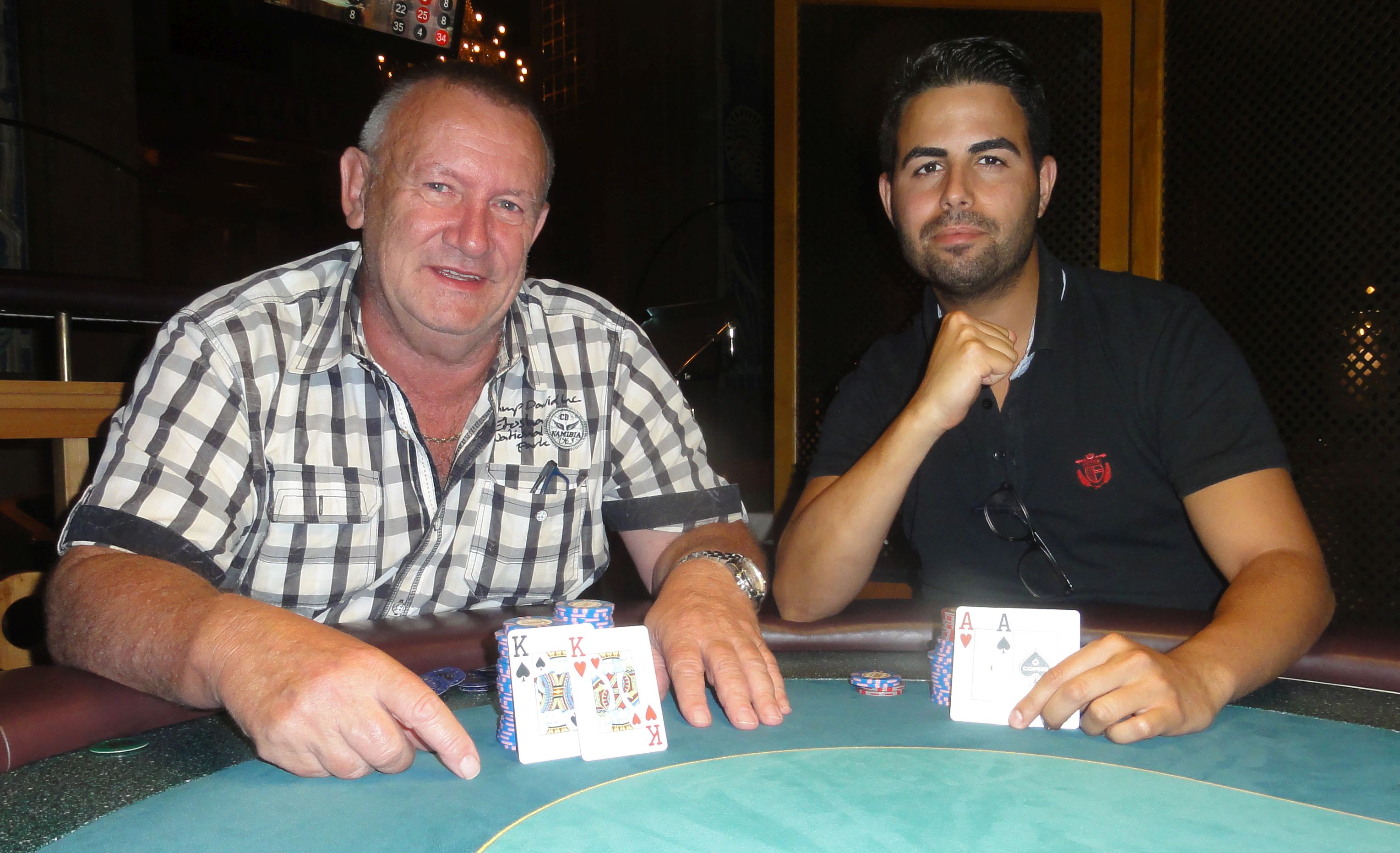 Wieder einmal „Ausverkauft“ hieß es beim gestrigen 200er Texas Holdem NL Turnier in unserer Poker-Arena. 50 Teilnehmer kämpften um den Preispool und am Ende kam es zu einem 4er Deal. Unser Bild zeigt die beiden Erstplatzierten Soler Suner und den „Kapitän“.