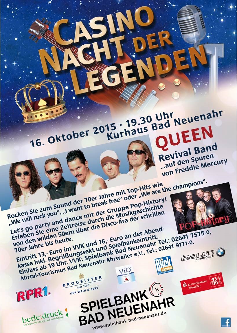 Bad Neuenahr. Erleben Sie die Welt von „Queen“ und „Freddie Mercury“ bei der Casino Nacht der Legenden am 16. Oktober 2015 im Kurhaus Bad Neuenahr. Mit einer spektakulären Live-Show, aufwendigen Lichteffekten und originalgetreuen Outfits wird die fünfköpfige „Queen Revival Band“ mit Welthits wie „I want to break free“, „We will rock you“ und „We are the Champions“ den Kurhaussaal zum Kochen bringen. Harry Rose, Sänger der Queen Revival Band, kommt dem Original „Freddie Mercury“ in Stimme und Auftreten beeindruckend nahe.