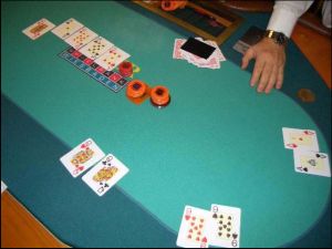 Nachdem sich einige Teilnehmer bereits am Cash-Game, das an Turniertagen immer schon ab 17:00 Uhr startet, warm gespielt hatten, erlebten sie das erste Highlight bereits im ersten Spiel des Turniers: Paar 9, Paar Damen und Paar Asse – das Board zeigte schließlich Dame, 9 und As! Also erklang schon vor der Pause einige Male ein „All-In“, das durch das darauf folgende „Seat open“ offensichtlich nicht glücklich beendet werden konnte. So wurde rasch der nächste Cash-Game Tisch eröffnet. Das Ziel der Spieler, in kürzester Zeit weitere Kontrahenten aus dem Turnier zu drängen, wurde zügig umgesetzt, so dass der Final-Table um 22:30 Uhr stand. Hier war öfter zu beobachten, dass die beste Hand erst auf dem River „abgebohrt“ wurde . So entwickelte sich ein Flush mit den Hole-Cards Pik 4, Pik 9. Blankes Entsetzen beim Favorit mit A-A , der sich im Spielverlauf nie als Verlierer sah.