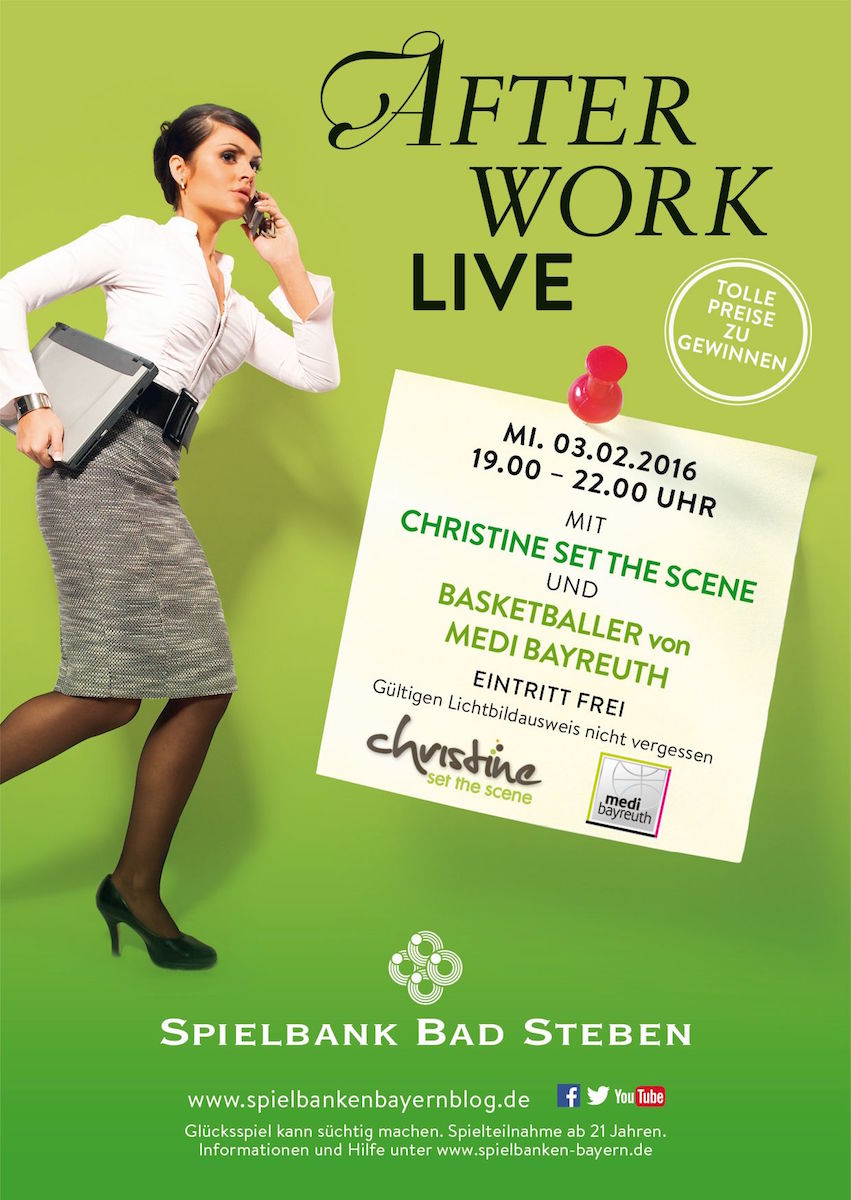 Fröhlich, fetzig und sphärisch – so klingt die musikalische Komponente bei der After Work Live am Mittwoch, den 03.02.2016. Christine set the Scene, die Band um Sängerin und Songwriterin Christine Mühlenkamp gibt Vollgas im Spielsaal der Spielbank Bad Steben. Ausgefeilte Arrangements, interessante Texte, eine bodenständige Instrumentierung und die einfühlsamen gesanglichen Darbietungen von Frontfrau Christine sorgen dafür, dass der Funke direkt aufs Publikum überspringt. Christine Set The Scene sind schon lange kein Geheimtipp mehr und ein Muss für jeden Fan von guter handgemachter Live-Musik. Die vier Bandmitglieder überzeugen mit Spielfreude und Dynamik. Gleiches gilt auch für die Basketballer von Medi Bayreuth. Bereits zum zweiten Mal schaut Trainer Mike Koch mit seiner Mannschaft beim After Work Live vorbei. Das Team um Kapitän Bastian Doreth gibt gerne Autogramme. „Erlebe Leidenschaft“, so heißt es auf der Homepage vom medi bayreuth. Ein passendes Motto auch für diesen Abend. Lassen Sie den Alltagsstress abfallen und genießen drei Stunden gute Laune.