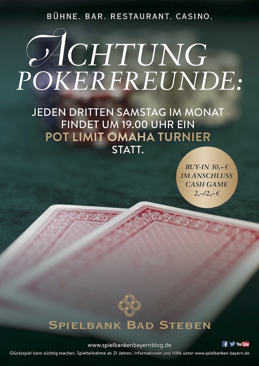 München, 17. Mai 2016 – Am Samstag 21.05.2016 findet in der Spielbank Bad Steben zum wiederholten Male ein Pot Limit Omaha Turnier statt. Gestartet wird um 19:00 Uhr. Der Buy-In beträgt 50 €.