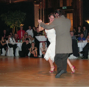 Nach 21 Uhr übernahmen die „Profis“, die unter anderem den Tangoszenen in Karlsruhe, Straßburg und Freiburg angehörten, das Geschehen auf der Tanzfläche. Zu den Klängen des Duos Poldy Tagle und Gabriel Merlino gaben sich die Paare bis weit nach Mitternacht dem gefühlvollen Tanz hin.