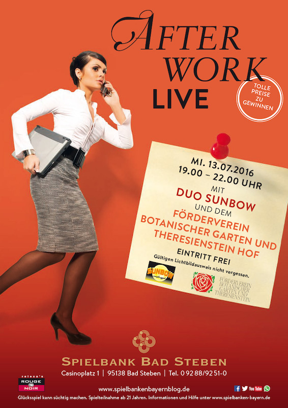 Spielbank Bad Steben informiert: After Work Live – 13. Juli 2016 mit Duo Sunbow und dem Förderverein Botanischer Garten und Theresienstein Hof e.V.