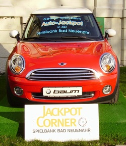 Der Auto-Jackpot der Spielbank Bad Neuenahr läuft weiter und wurde sofort mit einem Mini Cooper in pfiffigem rot mit weißem Dach und Streifen neu ausgestattet. Dieser kann täglich ab 14.00 Uhr an einem der acht Video-Slot-Automaten im Automatenspiel gewonnen werden.