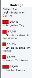 gaben an, dass sie immerhin noch zwei bis drei Mal in der Woche ein Casino besuchen. Auch diese Zahl ist überraschend. Somit haben sich mehr als ein Drittel der Abstimmenden „geoutet“, regelmäßig ein Spielcasino zu besuchen.