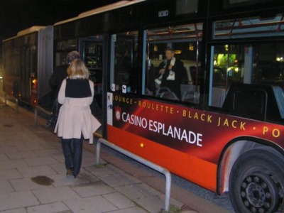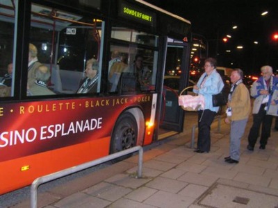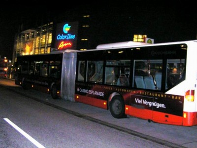 Nach einem stärkenden, rustikalen Imbiß im Casino Esplanade ging es mit dem Bus in die Color Line Arena, wo die „Freezers“ gegen den Tabellenzweiten vom Rhein aufs Eis gingen. Das Besondere des Busses: Er fährt sonst als Linienbus im gewöhnlichen Personennahverkehr über Hamburgs Straßen – und wirbt dabei für das Casino.