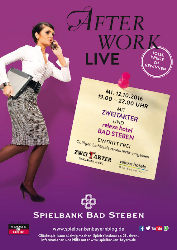 Kommen Sie vorbei und genießen Sie einen exklusiven Abend in der Spielbank. Übrigens das relexa hotel in Bad Steben betreibt seit Jahren auch das Spielbankrestaurant „relexa’s rouge et noir“. Zum After Work Live Event kreiert die Küche wieder leckere Tapas mit erfrischenden Cocktails.
