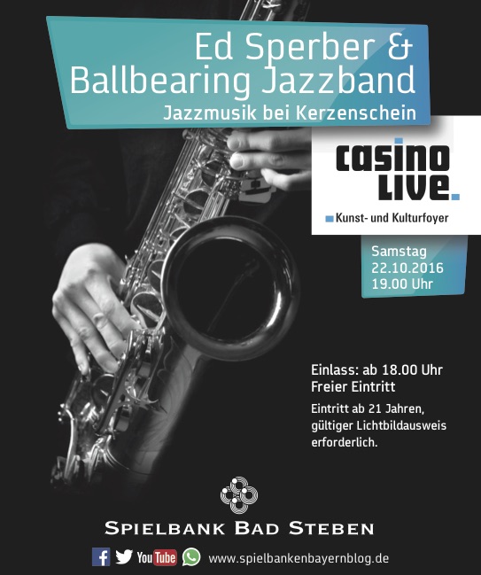Er ist beliebt und bewährt – der alljährliche Jazzabend in der Spielbank Bad Steben. Am Samstag, den 22. Oktober 2016 sorgt Ed Sperber & die Ballbearing Jazzband wieder für gute Laune. Die sechs herausragenden Musiker aus Würzburg präsentieren ab 19.00 Uhr, anspruchsvolle Musik bei Kerzenschein im eleganten Ambiente des Foyers. Die Band beherrscht die ganze Bandbreite des Jazz mit Evergreens von Duke Ellington über Benny Goodman bis hin zu Glenn Miller.