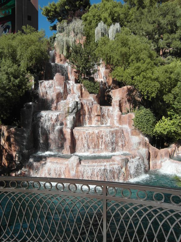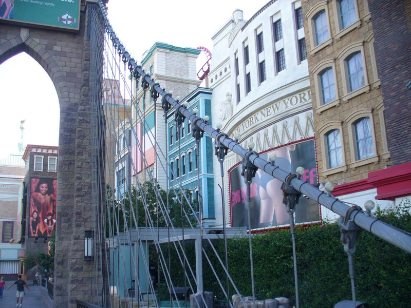 Gleich nebenan grüßt die Kopie der Freiheitsstatue am Hotel New York New York, das außen und innen entsprechend gestaltet ist. Rechts im Bild sieht man eine der Fußgängerbrücken über den Strip. Das Wechseln der Straßenseite ist aufwändig. Entweder gibt es Fußgängerampeln, an denen man gefühlte 5 Minuten wartet und dann mit einer Digitalanzeige in 20 Sekunden über 10 Fahrspuren gehetzt wird, oder die besagten Brücken. Diese enden aber nicht einfach auf der anderen Straßenseite, sondern meist im Gebäude. Dort landet man dann im Casino, und sucht mühsam den Weg raus ins Freie. Geschäft ist Geschäft!