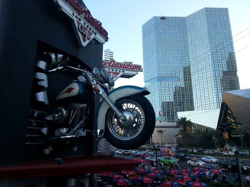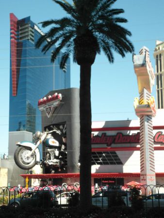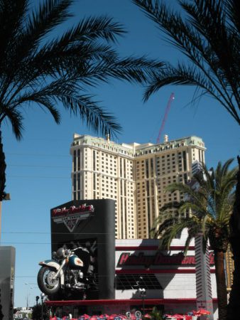 Von der anderen Straßenseite im Hintergrund eines der Aria Gebäude, und im Vordergrund das Harley Davidson Cafe. Wie ich kürzlich gelesen habe, wurde das Motorrad leider abgebaut.