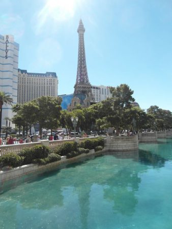 Wieder auf der anderen Straßenseite sieht man über den See des Bellagios hinweg das Ballys, das Paris Paris und das Planet Hollywood.