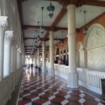 Eine Achterbahn fahrt außen entlang, innen mitten durch die Hotellobby.