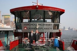 Hamburg, 30. April 2007. Pünktlich zur Sommersaison legt eine der Hamburger Hafenfähren im neuen Outfit der Spielbank Hamburg und ihrer Casinos Esplanade sowie Reeperbahn ab: Das 250 Personen fassende Schiff präsentiert sich dazu komplett in der Leitfarbe „Rot“ der Spielbank. Besonderer Clou: Einer der Tische auf dem Freiluft-Deck der Fähre ist wie ein Roulette-Kessel grafisch gestaltet. Otto Wulferding, Geschäftsführer der Spielbank Hamburg, sowie Jens Wrage, Vorstand Seetouristik und Fährdienst AG, gingen als erste Passagiere an Bord des neuen Casino-Dampfers.