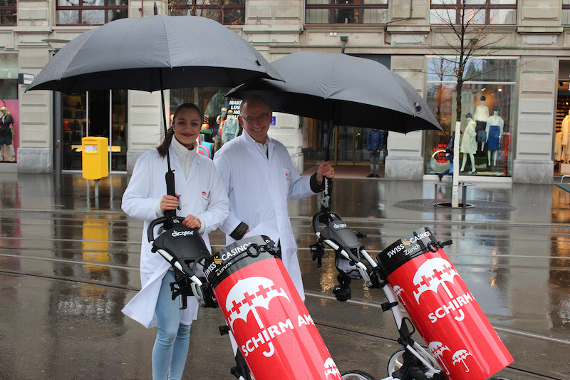 Nach den ersten warmen Frühlingstagen hat sich der Winter nochmals zurückgemeldet: Es ist kalt und nass! So auch am letzten Mittwoch, als Schnee und Regen die Zürcherinnen und Zürcher unfreundlich durch die Strassen begleiteten. Bei diesen Wetterkapriolen ist die Schirmambulanz von Swiss Casinos Zürich zur Stelle. Als Ärzte verkleidet, verteilten zwei Casino-Mitarbeitende rund 100 Schirme. Die Überraschung und Freude bei den Passanten war gross. Spontan und herzlich wurde das Einsatzteam der Schirmambulanz umarmt, geküsst oder einfach nur angestrahlt.