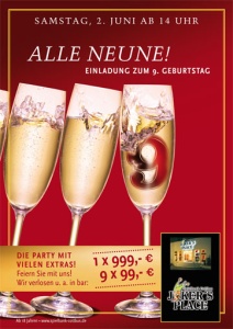 Unter dem Motto „Alle Neune“ lädt die Spielbank Cottbus Joker’s Place am Sonnabend, den 2. Juni 2007, ab 14 Uhr zu ihrem neunjährigen Bestehen ein. Mit einem Glas Sekt „auf’s Haus“ kann jeder Gast auf den Geburtstag anstoßen. Beim kostenlosen „Tischkegeln“ besteht die Chance auf weitere Lose für die Tombola um neun Minuten nach Mitternacht. 1. Preis: 999 € in bar. Weitere attraktive Bargeldpreise winken ebenso wie die eine oder andere Überraschung!