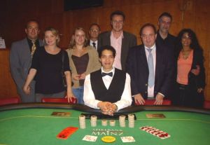 Bild (v.l.n.r.): Harald und Viktoria Willareth (3.), Cathrin Endres (4.), Floorman Thomas Lautenschläger, Markus Jordan (1.), Henryk Nowakowski (2.), Mario Henrich (5.) mit Freundin Natalia Usinger und Dealerin Sam