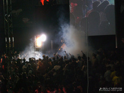 Michael Körner heizte die Menge ein (was er eigentlich gar nicht mehr musste – sie alle waren schon voll aufgedreht), und kündigte die Pokerstars an. War es vorher noch tumultartig laut, so trat augenblickliche Ruhe ein. Die Ruhe vor dem Sturm. Nachdem ein Video der Giganten gezeigt wurde, verloschen die Lichter und am Eingang an dem die Weltmeister herein schritten, tauchte vorerst eine Nebelwand auf.