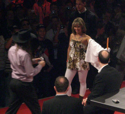 Chris Ferguson verwandelte die Halle mit seiner Showeinlage noch einmal in ein wahres Tollhaus. Er warf mit einer Karte auf eine Karotte die seine Begleiterin geschützt durch ein Handtuch fest in der Hand hielt. Dahinter zwei Sicherheitsleute die eine Glaswand hochhielten um die fliegenden Karten ab zu halten nicht in die Menschenmenge zu fliegen. Er schaffte es tstsächlich, mit einer Karte die Karotte zu zerschneiden und wurde fanatisch bejubelt.