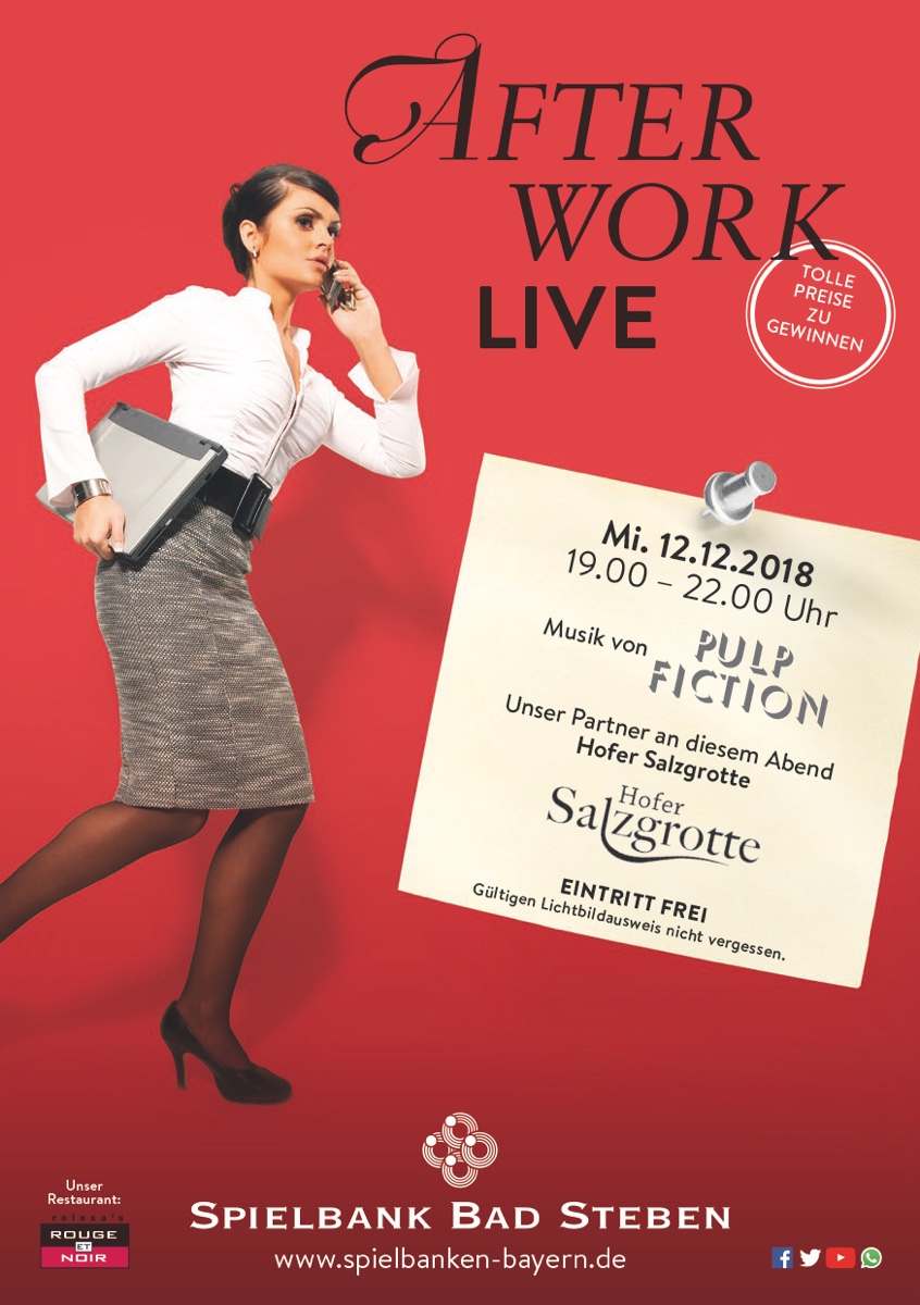 Alle Besucher der After Work Live Veranstaltung am Mittwoch, den 12. Dezember 2018 können sich von 19 bis 22 Uhr auf ein explosives Gemisch aus Rock-, Funk-, und Beat-Klassikern freuen! Die Band Pulp Fiction besteht aus sechs Musikern und einer Sängerin und sticht durch ein ungewöhnliches Repertoire hervor. Die Mitglieder der Gruppe haben es sich zum Ziel gesetzt, instrumentale Rock-Power mit mehrstimmigem Gesang zu paaren. Für den Ausgleich und die Entspannung an dem Abend, sorgt hingegen unser Partner. Die Hofer Salzgrotte ist der perfekte Ort für Ruhe und Regeneration. Seit Jahrhunderten ist die Wirkung von Salz bekannt und wird heute für Therapie-, Erholungs- und Wellness-Zwecke genutzt. Auf bequemen Wellness-Liegen, unter warmen Decken in besonderer Atmosphäre mit Entspannungsmusik und dezenter Beleuchtung kann man sich wohlfühlen und genießen. Nehmen Sie sich Zeit und lernen Sie die Angebote der Hofer Salzgrotte kennen und erfahren zudem Wissenswertes rund um das Thema Salz. Die Spielbankgastronomie „relexa’s rouge et noir“ sorgt mit verlockenden Tapas und leckeren Drinks für die Verköstigung. Der Eintritt zur After Work Live-Veranstaltung ist kostenfrei.