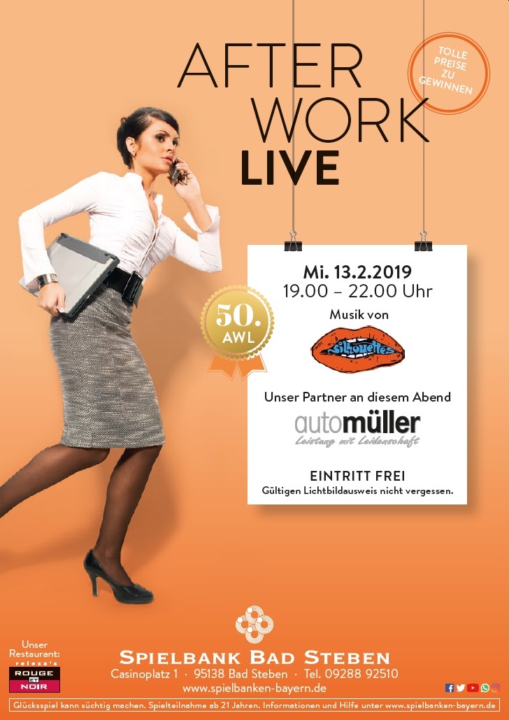 Die Spielbank Bad Steben bietet vielfältige Veranstaltungen. Highlights sind die monatlichen After Work Live Partys, die entspannte Abende versprechen. Dazu gehören mitreißende Live-Musik, kühle Drinks und interessante Gespräche mit regionalen Partnern. Im Jahr 2015 aus der Taufe gehoben, findet nun am 13. Februar 2019 die 50. After Work Live Party statt. Und das wird natürlich gefeiert: Die Band The Silhouettes, die ebenfalls schon seit über 50 Jahren musikalisch unterwegs ist, präsentiert Lieder der magischen 60er- und der flippigen 70er-Jahre – zum Zuhören und Tanzen in angenehmer Lautstärke.
