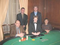 Bild (v.l.n.r.): Stehend: Axel Schürmann (3.), Floorman Oliver Gutermilch Sitzend: Turniersieger Anton Jakob, Dealer Thomas Grein, Yhieu Phom (2.)