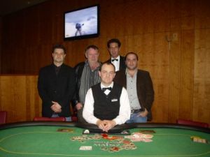 V.l.n.r. Tobias Hundhausen (3.), Gerd Wandel, Dealer<br />Andreas Kölsch, Floorman Raimund Krug, Ingber Sharon Es standen 2.700 Euro Preisgeld zur Verteilung an und so spielten die 27 Teilnehmer von Beginn an sehr konzentriert. Am Final Table war die Stimmung sehr ausgelassen und der spätere Dritte, Herr Tobias Hundhausen, genoss sichtlich das gute Gefühl schon im Geld zu sein. Es standen 2.700 Euro Preisgeld zur Verteilung an und so spielten die 27 Teilnehmer von Beginn an sehr konzentriert.