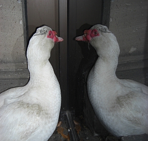 Der Ganter Burkhardt mit seinem SpiegelbildWas den Ganter – kurzerhand Burkhard getauft – dazu bewegt hat, sich diesen Platz auszusuchen, bleibt sein Geheimnis. Allerdings lassen sein steter Blick in das verspiegelte Glas und sein dabei wackelndes Hinterteil wohl eher auf das Ausleben seiner Eitelkeit schließen.