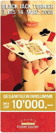 Luzern, 29. Februar 2008 – Das Grand Casino Luzern lanciert dieses Jahr am Freitag, 7. März 2008 mit dem Start des ersten Black Jack Turniers die 3er Serie 2008. Das zweite Turnier findet vom 30. Mai – 6. Juni und das dritte vom 3. – 10. Oktober statt. Wir freuen uns auf spannende Spiele.