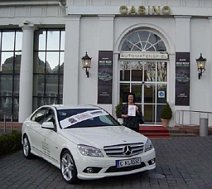 Wiesbaden, 10. März 2008. Sprachlosigkeit – dann strahlende Freude: Eine Besucherin aus Groß-Gerau knackte im Automatenspiel der Spielbank Wiesbaden am Weltfrauentag den Auto-Jackpot und kann nun eine Mercedes-Limousine 220 CDi im Wert von knapp 50.000 Euro ihr eigen nennen. Dass sie den Jackpot gewonnen hatte und die Trompetenfanfaren ihr galten, konnte die Spielerin zunächst gar nicht glauben. Spätestens nach einem kurzen Probesitzen in ihrem neuen Wagen jedoch war der Jubel gewaltig – und dass die Fahrten in dem schnittigen Wagen mit mehr als 3000 Euro Benzingeld versüßt werden, macht das Glück perfekt.