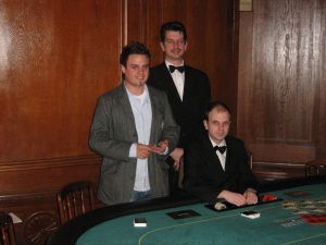 V.l.n.r. Thomas Müller (1.),  Floorman Karl Friedrich Mohr,<br />Dealer Gregor SojkaIn der entscheidenden mittleren Phase des Turniers konnte er innerhalb kurzer Zeit zwei dicke Pötte gewinnen, als er jeweils am Flop das Top-Paar traf, der Gegner das Ass als einzige Overcard jeweils am Turn bekam und Thomas Müller dann am River mit dem Drilling kontern konnte. Es war ein Wechselbad der Gefühle für ihn, doch die finale Hand war deutlich entspannter, auch diese gewann er gegen seinen Gegner mit einem Drilling.