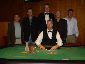 V.l.n.r. Turniersieger Antonio Ciardo, Oliver Mansuer (2.),<br />Floorman Mitchell Ward, Oliver Ladner (4.), Christian<br />Jungkind (3.), Dealer Oliver GutermilchMainz, 24. Mai 2008: Antonio Ciardo spielte im 34-köpfigen Teilnehmerfeld zunächst unauffällig und zurückhaltend, gewann einige kleinere Pötte und hielt sich bis zum Final-Table tapfer. Dort schrumpfte mit steigenden Blinds auch sein Stack zusehends, was ihn zu seinem ersten All-In zwang.