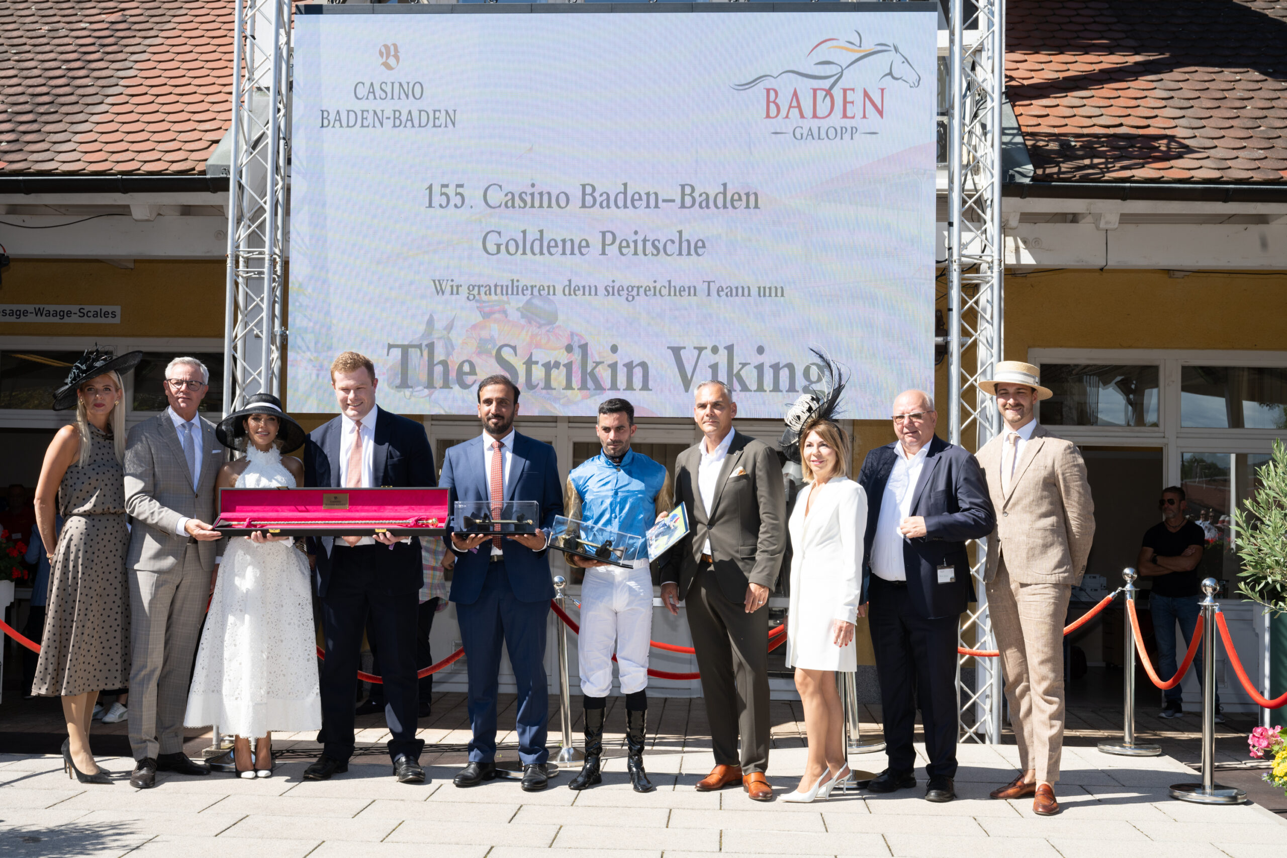Baden-Baden, 4. September 2025 (uf) Am 31. August 2025 erlebte die traditionsreiche Galopprennbahn Iffezheim mit der 155. Casino Baden-Baden Goldenen Peitsche einen glanzvollen Höhepunkt der Grossen Woche. Vor mehr als 10.000 Zuschauern gewann der in England trainierte Außenseiter „The Strikin Viking“ überraschend das bedeutendste Sprint-Rennen des deutschen Galopprennsports – und sicherte sich damit den begehrtesten Ehrenpreis der Szene.