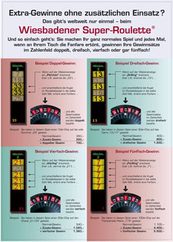 Und so einfach geht es: Sie machen Ihr normales Spiel und jedes Mal, wenn an Ihrem Tisch die Fanfare ertönt, gewinnen Ihre Gewinnsätze im Zahlenfeld doppelt, dreifach, vierfach oder gar fünffach. Ein Beispiel: Erscheint auf der Walzanzeige, die über allen Roulette-Tischen hängt, ein Pärchen „zweimal die Null oder jede andere beliebige Zahl“ und die Kugel fällt anschließend in die selbe Zahl, ertönt eine Fanfare und alle Gewinnseinsätze im Zahlenfeld werden doppelt ausgezahlt. Das bedeutet, wenn sie auf die Null einen 10er Chips gesetzt haben, würden Sie im Normalfall 350,- Euro erhalten. So aber verdoppelt sich der Gewinn um nochmals 350,- Euro und Sie erhalten insgesamt 700,- Euro. Diese Chancen, die dadurch entstehen, ohne einen Cent Mehreinsatz leisten zu müssen, gehen aber bis ins fünffache des Gewinnes. Auch hier ein Beispiel: Mit einer „Transversale Plein (7-9)“, gesetzt mit 100,- Euro. Wenn auf der Walzenanzeige ein „Fünfling“ erscheint „also 5x die 7“ und anschließend die Kugel im Roulettekessel in die 7 fällt, ertönt wieder eine Fanfare und Sie erhalten das Fünffache ihres Gewinnes. Im Normalfall hätten Sie das 11-fache erhalten, also 1.100,- Euro. Durch das „Wiesbadener Super-Roulette“ gewinnen Sie nun insgesamt 5.500,- Euro.