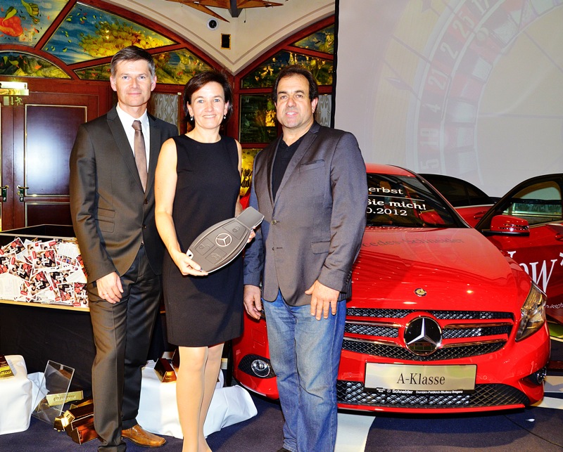 Casino Direktor Bernhard Moosbrugger, Verkaufsleiter Werner Metzler und Geschäftsführerin Mag. Karin Seyfried von Mercedes Schneider in Dornbirn freuten sich mit dem strahlenden Gewinner.