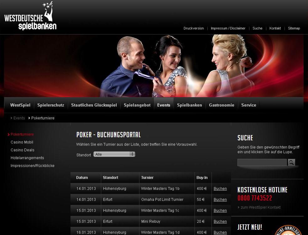 Duisburg, 14. Januar 2013. Pokerfans können sich ab sofort bequem online für Turniere in den Spielbanken der WestSpiel-Gruppe anmelden. Das neue Buchungsportal ist über die Website www.westspiel.de erreichbar und macht die Teilnahme denkbar einfach: Man wählt das gewünschte Turnier, trägt sich ein und zahlt sein Buy-in per Kreditkarte oder GiroPay.