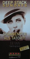 Das 75+5 Turnier am gestrigen Sonntag, dem 16. Juni, war wieder komplett ausgebucht. Thema unter den 60 Teilnehmern vor dem Turnierstart um 20 Uhr war natürlich die derzeitige WSOP in Las Vegas und der in zwei Wochen stattfindende 500er Deep-Stack-Sunday in Wiesbaden. Tenor: „Für Vegas hab ich keine Zeit, aber beim DSS am übernächsten Sonntag in Wiesbaden bin ich mit an Sicherheit grenzender Wahrscheinlichkeit wieder dabei!“