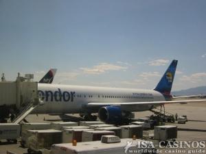 Die Anreise von Chiasso verlief zügig und gemäß Zeitplan. Um 9.15 Uhr treffe ich am Flughafen ein, wo ich einen Termin mit Mr. M., einem Highroller für Slotmaschinen, habe. Er wird mich auf der Reise nach Las Vegas begleiten. Check-In direkt durch bis Las Vegas, via Frankfurt am Main. Zuerst fliegen wir mit einem Lufthansa Shuttle, anschließend, ab Frankfurt, geht es dann weiter mit dem Nonstop Charter der Condor. Die totale Flugdauer beträgt rund 11 Stunden 40 Minuten, Ankunftszeit in Las Vegas ist 17.20 Uhr Ortszeit. Die Bestuhlung in der Condor-Maschine ist, wie zu Erwarten, sehr eng, was es nahezu unmöglich macht, zu schlafen. Ansonsten ist der Service an Board zufrieden stellend. Einige Passagiere beschweren sich, wenn sich die vor ihnen befindlichen Passagiere ihre Sitzlehne voll zurückstellen und wollen, dass der „Vordermann“ den Sitz wieder geradestellt. Dies führt zu einigen Diskussionen, wie ich gesehen habe. Offenbar wollen einige dieser Neckermann/TUI-Touristen auf den Komfort eines regulären Linienfluges nicht verzichten, dabei aber den Spartarif bezahlen. Doch das System läuft so leider nicht. Gelegentlich muss man Abstriche in Kauf nehmen.