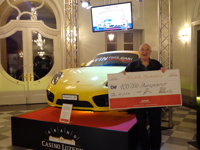 An einem Grand Roulette Spielautomaten gewann der 80 jährige Gast den 3. und letzten Porsche Cayman S Auto Jackpot 2013. Überwältigt vor Freude nahm er das Traumauto zusammen mit 5‘000.- Franken in bar entgegen und feierte seinen Gewinn mit einem Siegerfoto.