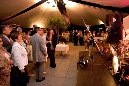 Auf der Terrasse trotzte man währenddessen den widrigen Witterungsverhältnissen. Die Juwelen von Präg Dornbirn ersetzten die Sonnenstrahlen und brachten zumindest die Augen der weiblichen Gäste zum Leuchten. Die Swinging Party Band mit Sängerin Bonnie Jeanne Taylor verstanden es, für die richtige Stimmung zu sorgen. Kulinarisch verwöhnt wurde die illustre Gästeschar mit Mohrenbräu Spezialitäten, kreiert von Wolgang Ponier und der Falstaff Crew.