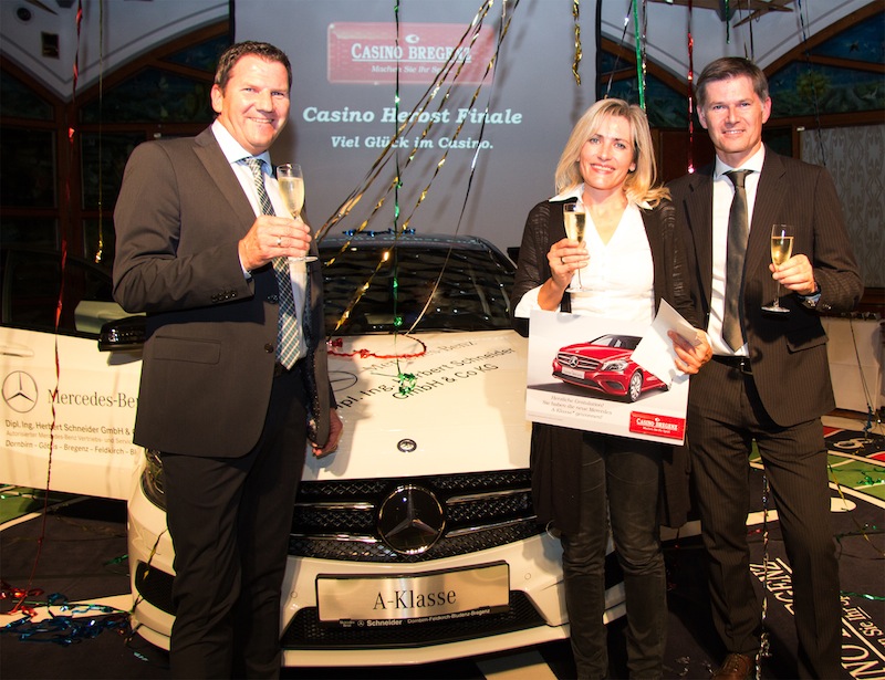 Der Besucherandrang im Casino Bregenz war mit knapp 1.800 Gästen an diesem Sonntagabend rekordverdächtig. Casinodirektor Bernhard Moosbrugger und Verkaufsleiter Werner Metzler von Mercedes Schneider in Dornbirn freuten sich mit der strahlenden Gewinnerin und gratulierten herzlich.